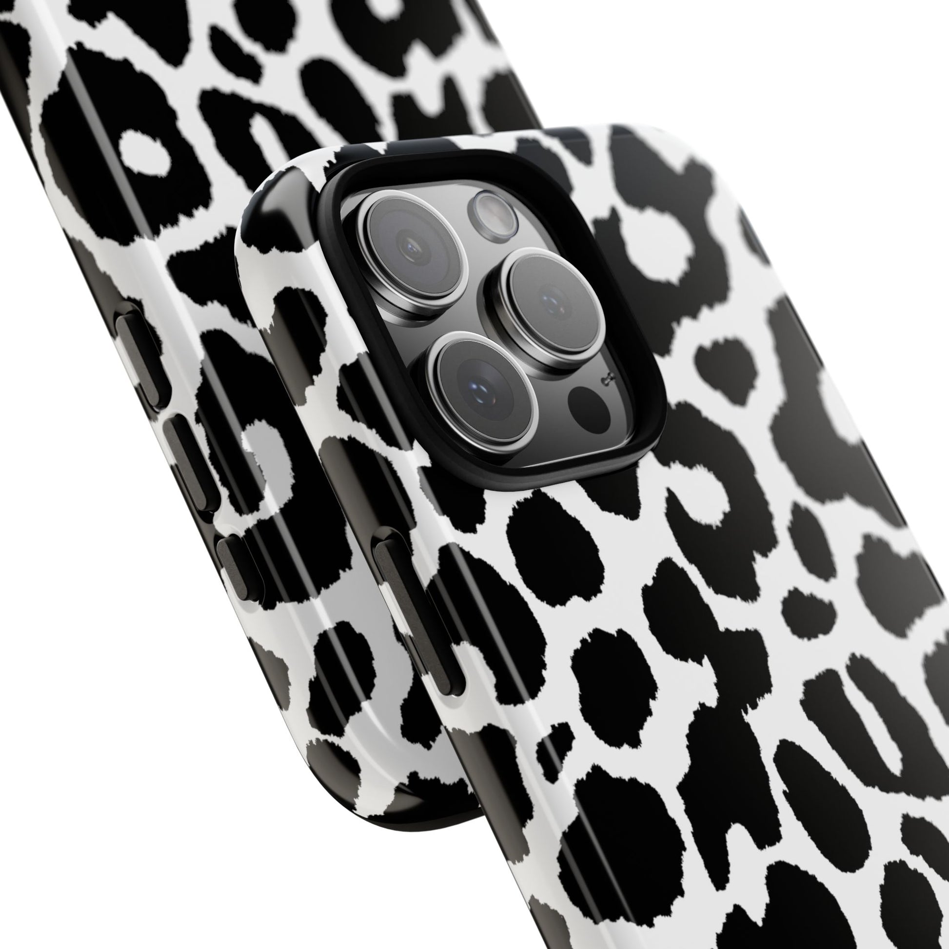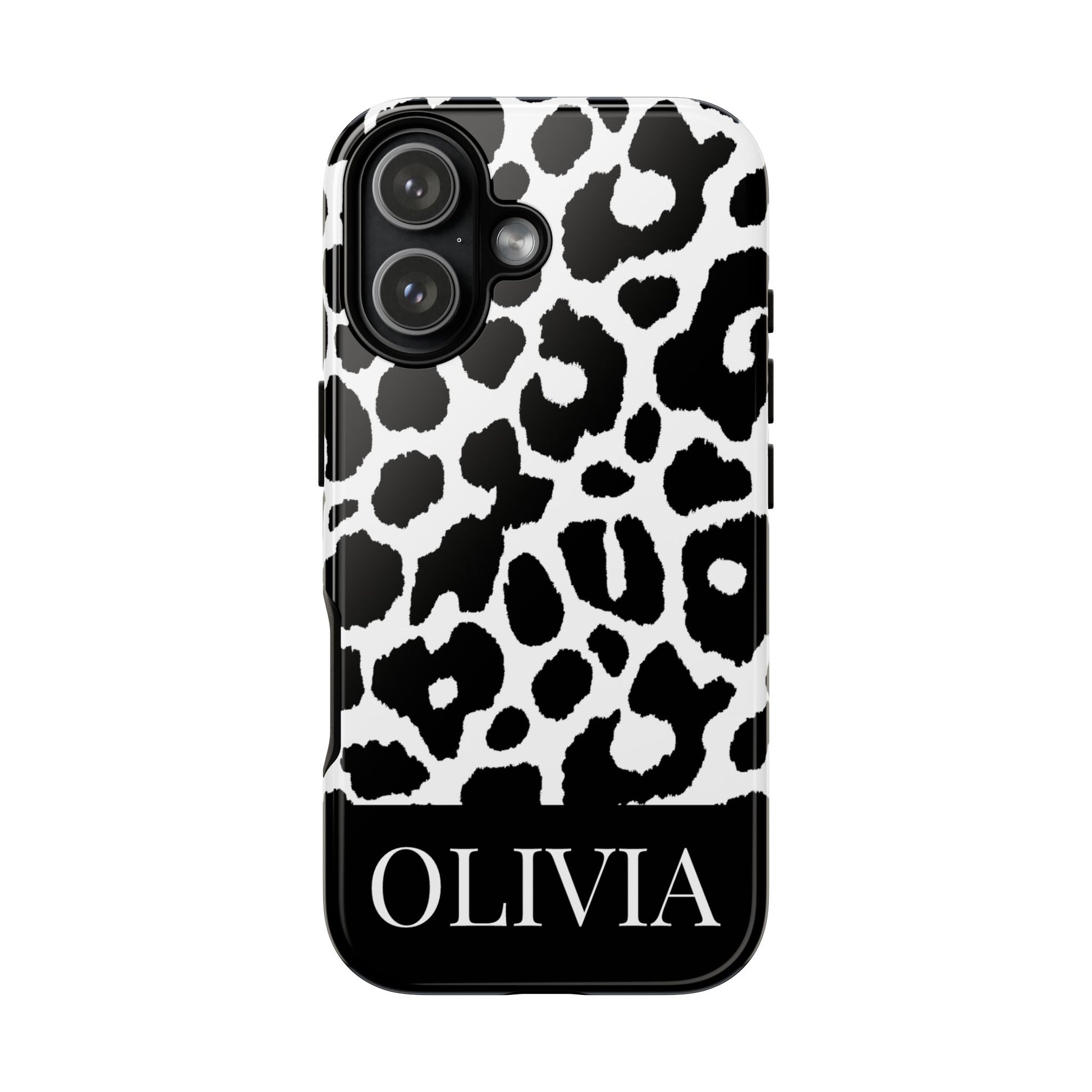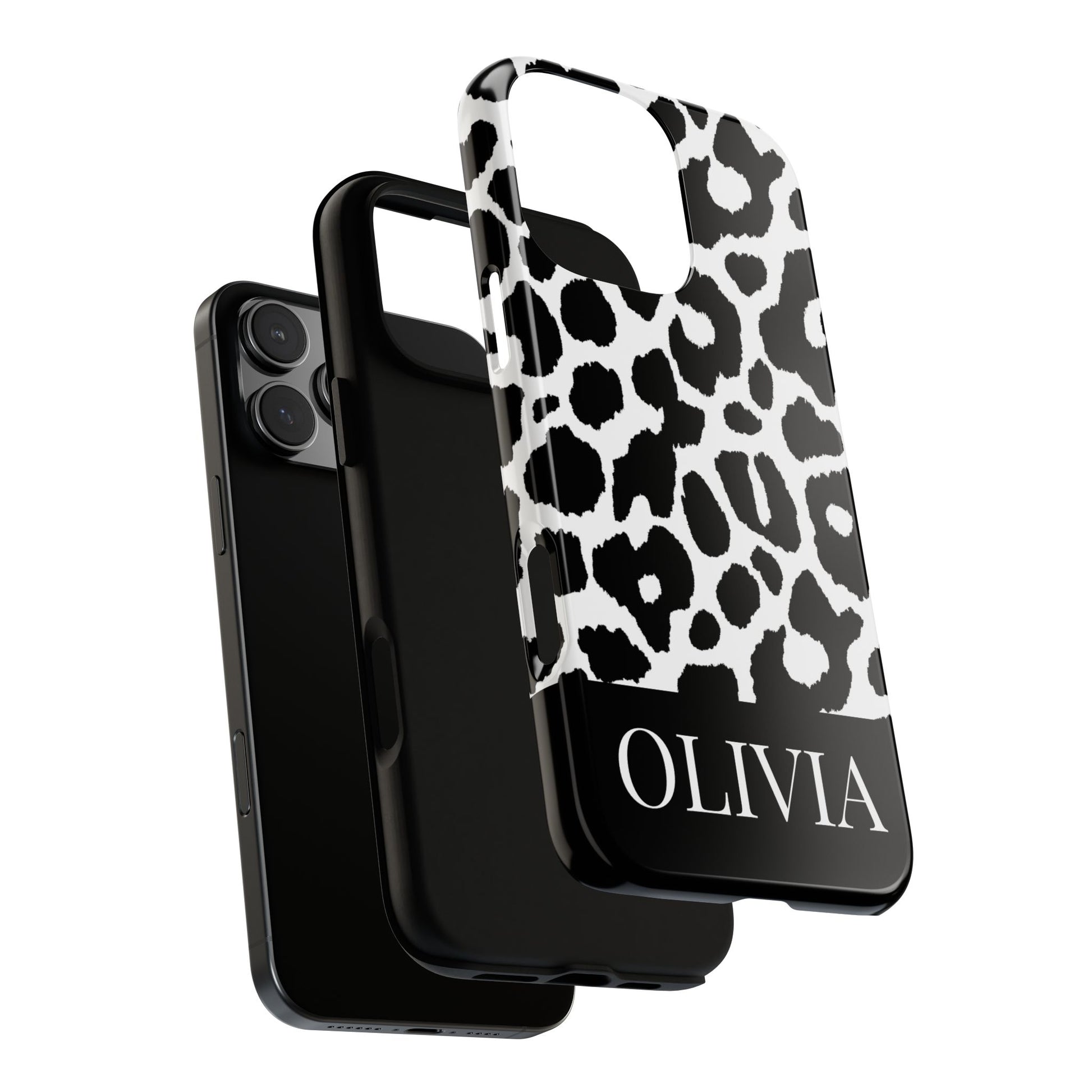 Elevate your style with our Personalized Black & White Leopard Print Tough iPhone Case, designed to showcase your unique name. Featuring precise cutouts for easy access to buttons, ports, and camera, its slim profile maintains a sleek look while ensuring a secure grip. The high-resolution leopard print design resists fading and adds a touch of wild elegance to your iPhone. Perfect for gift-giving or everyday use, this custom iPhone case and phone cover combines fashion and function for uncompromised protection.